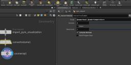 8. On the Convert Volume node, set the Isovalue to 1, check Compute Normals, and set group to the value @name=heat @name=temperature