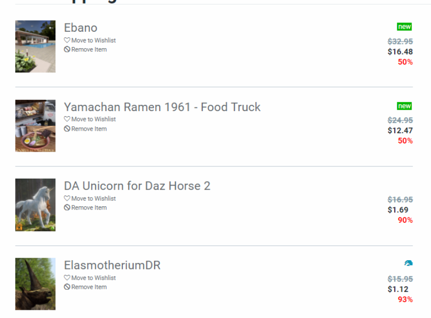 Edited: It worked for me hours ago, but with the New Debuts. It's $1.69 for the Unicorn for Daz Horse 2. And I use Chrome. Everything worked from the get-go but I only bought New Debut items. I have Ebano and the Food Truck in my cart.   So Still New does indeed seem to be what's failing.