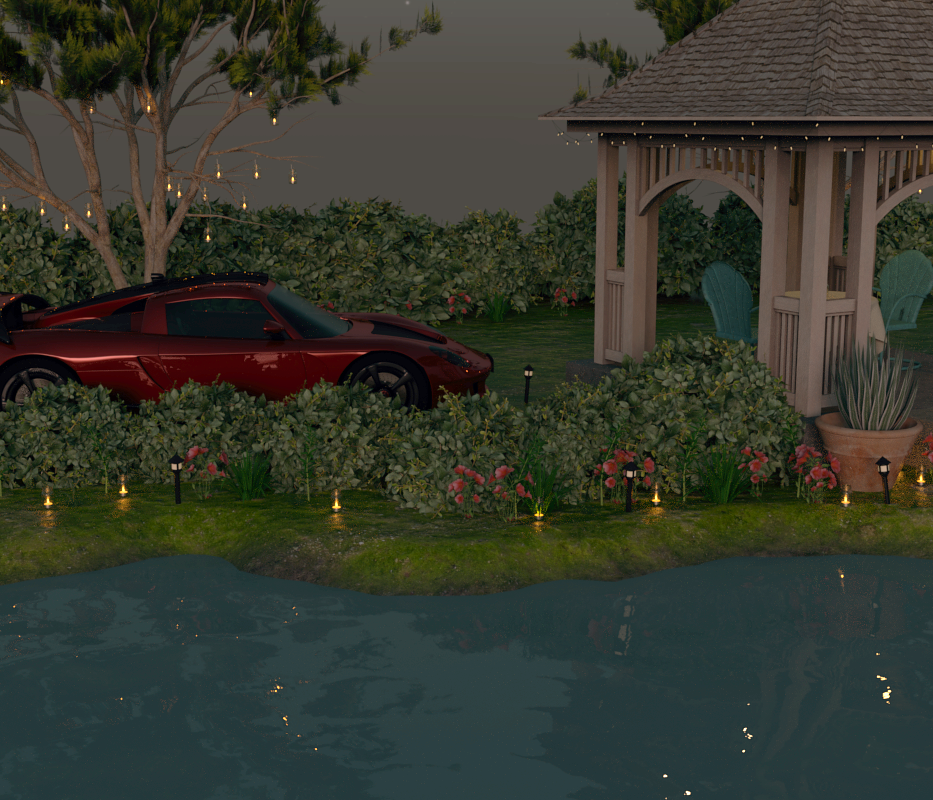 I'm just testing out those Bell garden lights, when the scene has overall lighting and heading into dusk. Although it had extended time and max samples, there was still some noise.