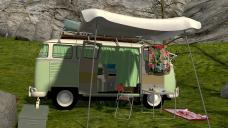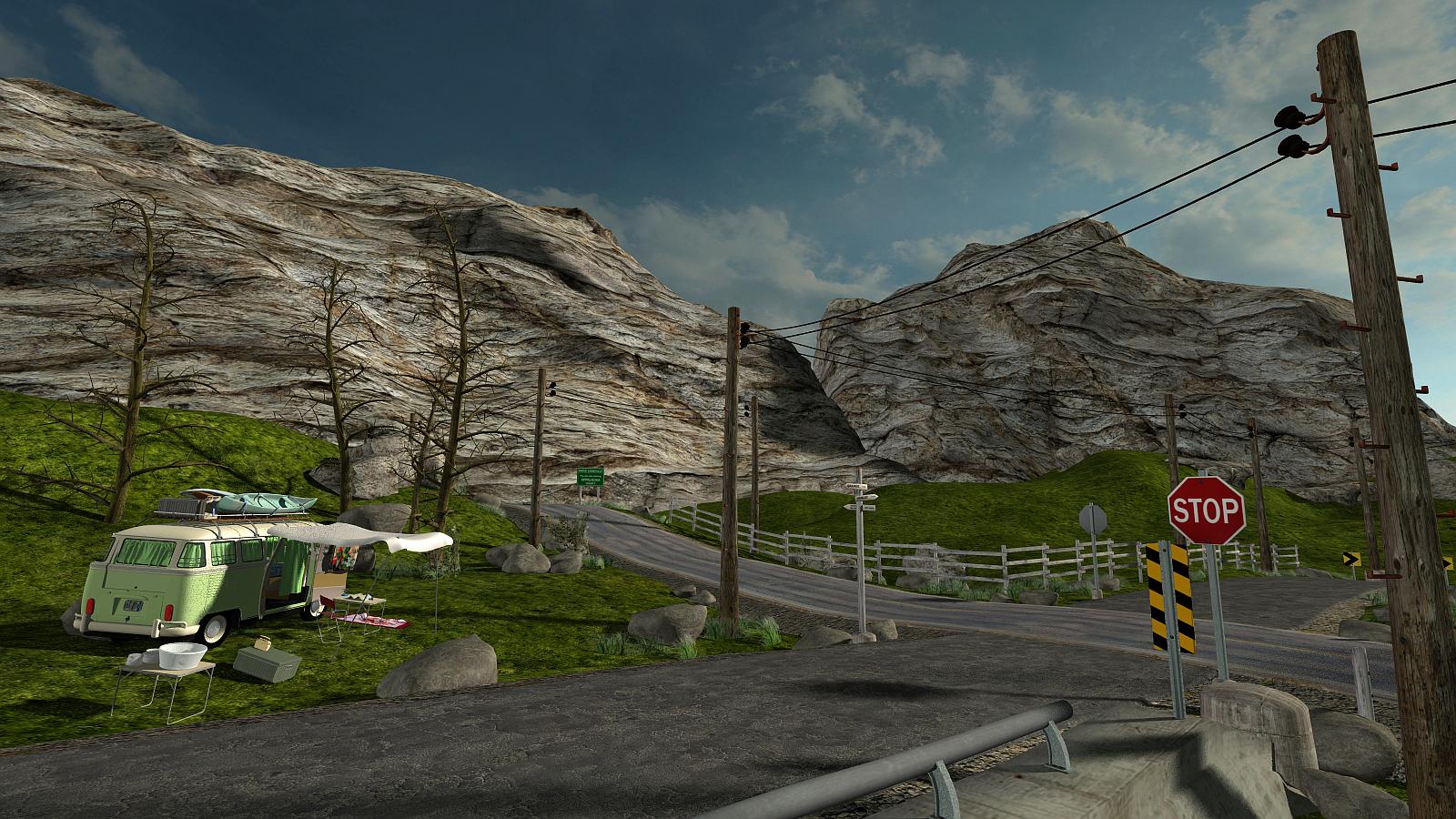 Back when I was graduating from high school, the VW van was an icon for low-cost young adult travel. Here's Road Trip Hippy Van set in FirstBastion's Rural Crossroads with one of his skydomes. The van comes with Iray and 3DL presets. In this render, I used 3DL since Rural Crossroads is an older 3DL set. As always, every 3DL material loads with 100% Specular and the van also had 100% Ambient, so you need to tone those down if you don't want a washed out scene.