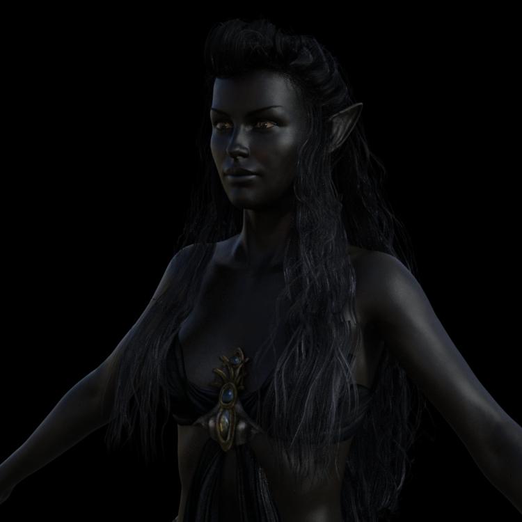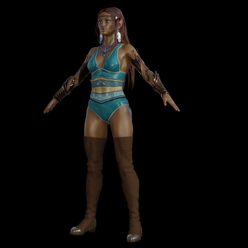 I was using the skin from Eliya (G3), but she was too dark. She looked more golden in the promos. So I fiddled with Base Color and Translucency, but that still wasn't enough. Finally I lightened all the textures in Photoshop to get that nice golden tone I was looking for. This is the character before Photoshop: (I did make some changes to the face after this, see above).