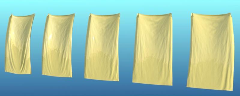 The above image doesn't show much since it was draped vertically with gravity alone. The next image has wind applied. As you can see, there's a lot more variation on towels 4 and 5 then what shows with the vertical draping. Since the folds that form in towel 1-3 are mostly suppressed, you wouldn't want to use these levels of dynamic strength for a towel, but you may want to for a piece of paper that was crumpled and then unfolded. If you take the Dynamic Strength down to 0.25 (not shown), the towel ends up flat and smooth.