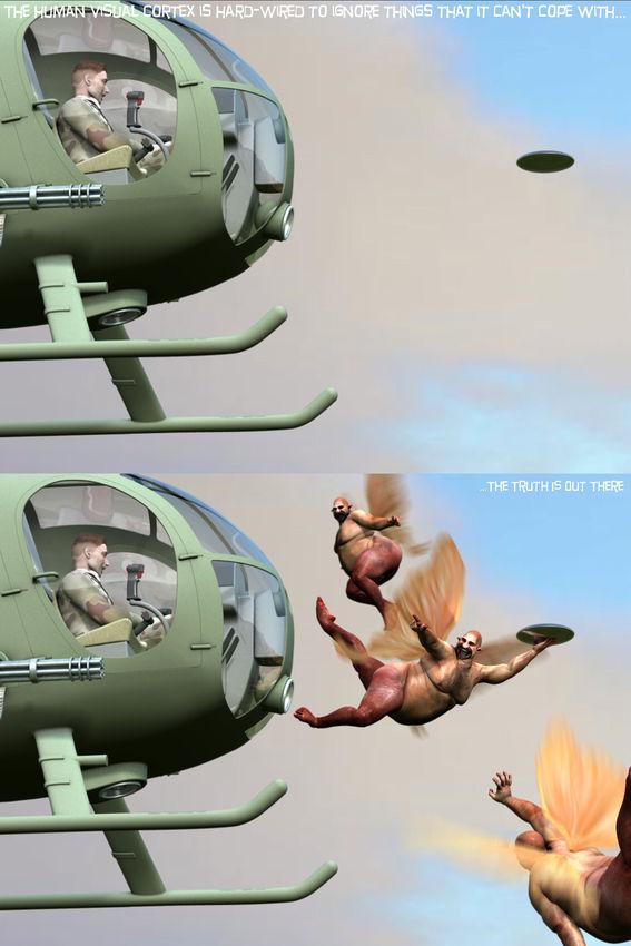 "This is whiskey tango foxtrot - is anybody seeing what I'm seeing ? This is unbelievable ! I have eyeballs on the strangest goddamn thing I've ever seen in my life, and I've seen a few ! It's at my ten o'clock, difficult to judge size or distance - looks like a flatted sphere of polished silver. It's keeping pace with me and copying my every manoeuvre. Do you have anything on radar ?"