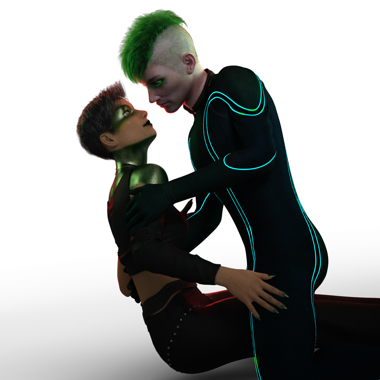 Here's a more dramatic difference. This is one I did when Ren for G3M and G8M came out. He's with Envy of the Seven Deadly Sins. Lighting is Marshian's wonderful Rim Light Rig for Iray. There's some postwork to correct a few issues, added a photo background and used Star Effects and Glow heavily. They're great for fantasy and superhero renders.