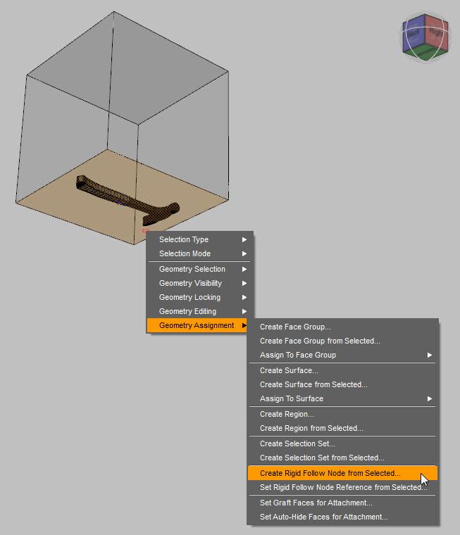 f. Next add a rigid follow node to the box. Go to the Tool Settings pane and from the drop down box choose Geometry Editor. In the viewport left-click on the bottom face of the upper cube. Then right-click in the viewport and select Geometry Assignment/Create Rigid Follow Node from Selected… and give it a name when the dialog box opens.