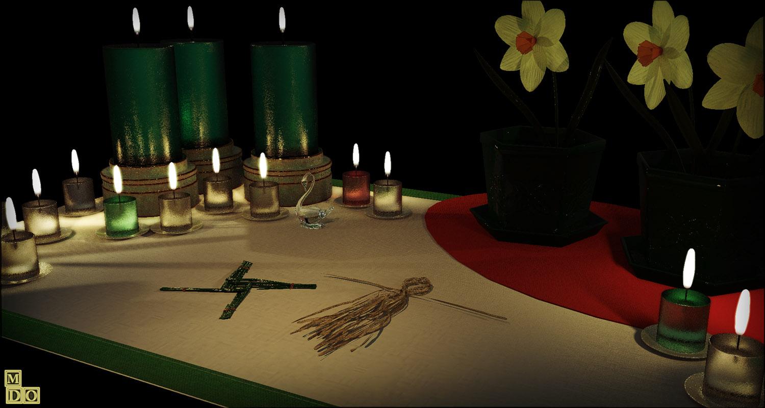 In the main freebies thread, @kimh was looking for a Brigid's Cross anda corn dolly for Imbolc decorations (https://www.daz3d.com/forums/discussion/comment/3281861/#Comment_3281861) and I thought I'd take a pass at them. Then I went a little nuts and made a whole Imbolc altar.