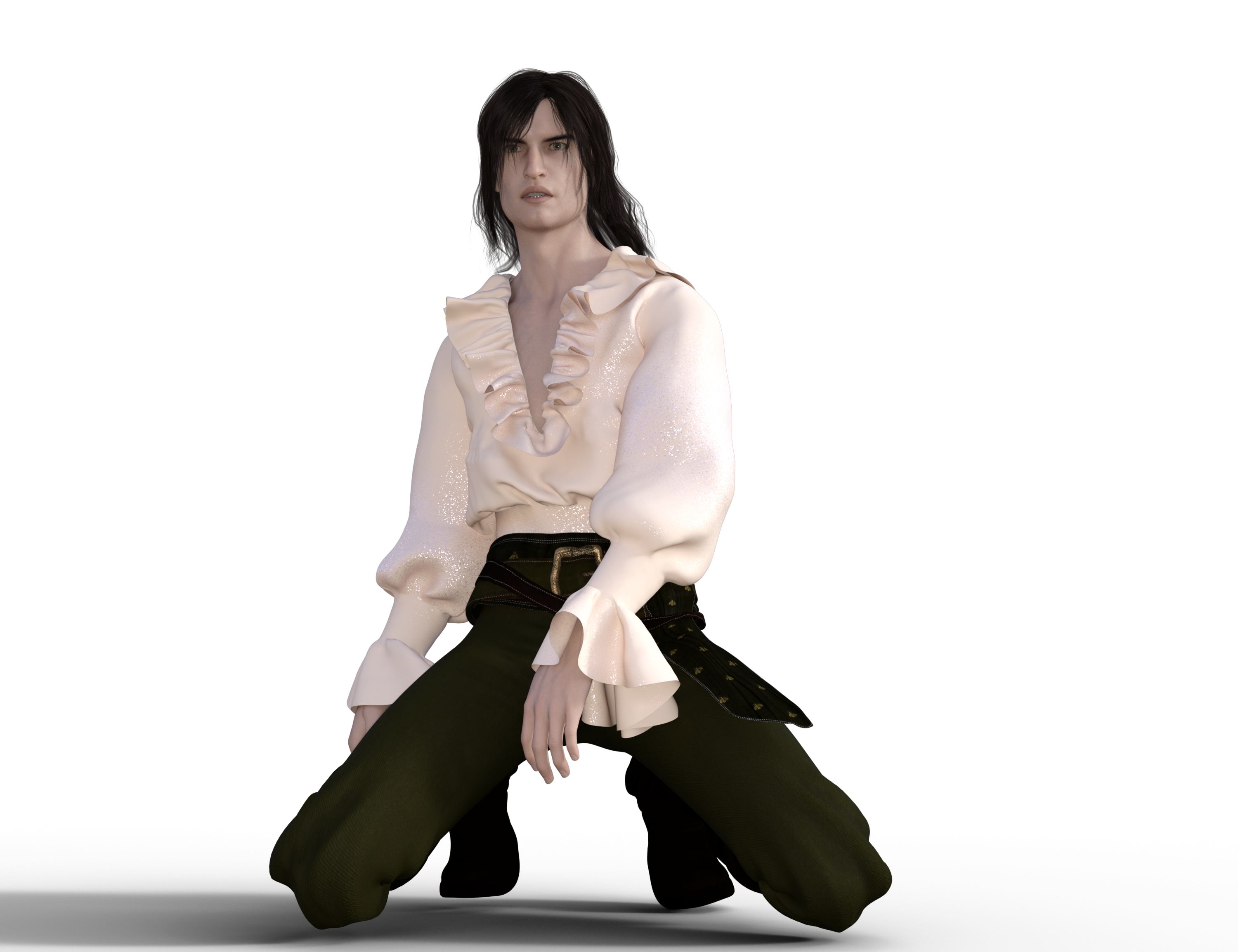 I have been looking for a good flowy poets shirt for male characters and haven't found any. However, I saw one for G8F by Lully at Rendo and purchased it. The out of the box version is attached (and not rendered fully as it was just a test) - it shows the midriff and doesn't work well for what I wanted. However, after I added a belt, I think it looks pretty good. It could be a bit less feminine but it will do. Note, it works with dForce and might work even better with a simulation, I just haven't learned how to do that yet. Character is Vincent. Hair is Willis hair