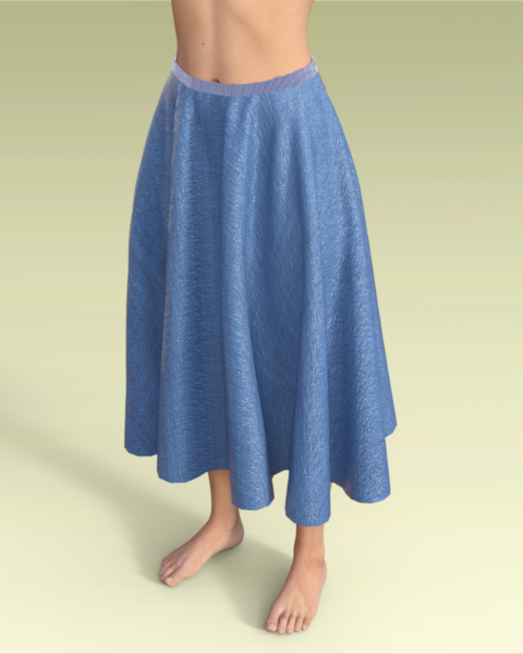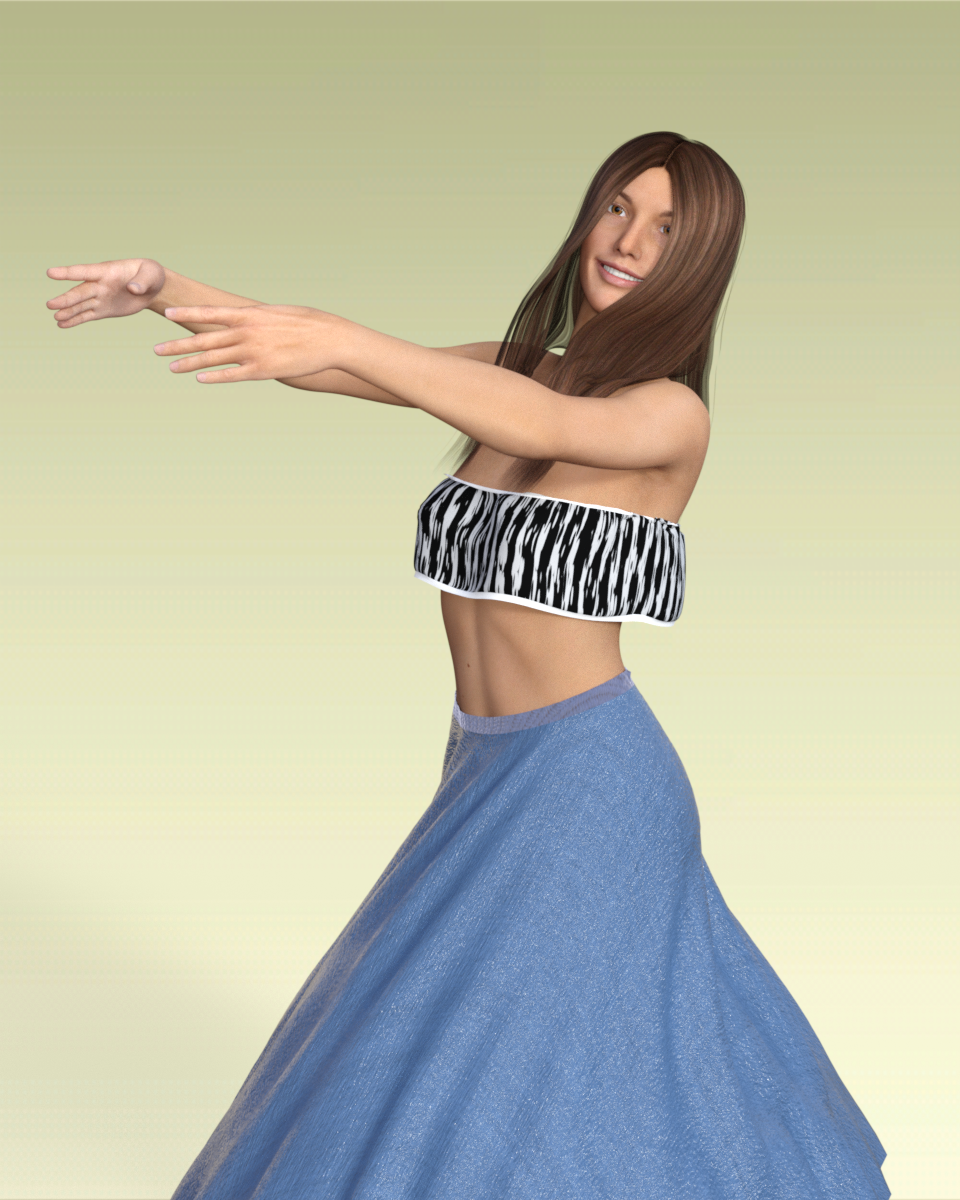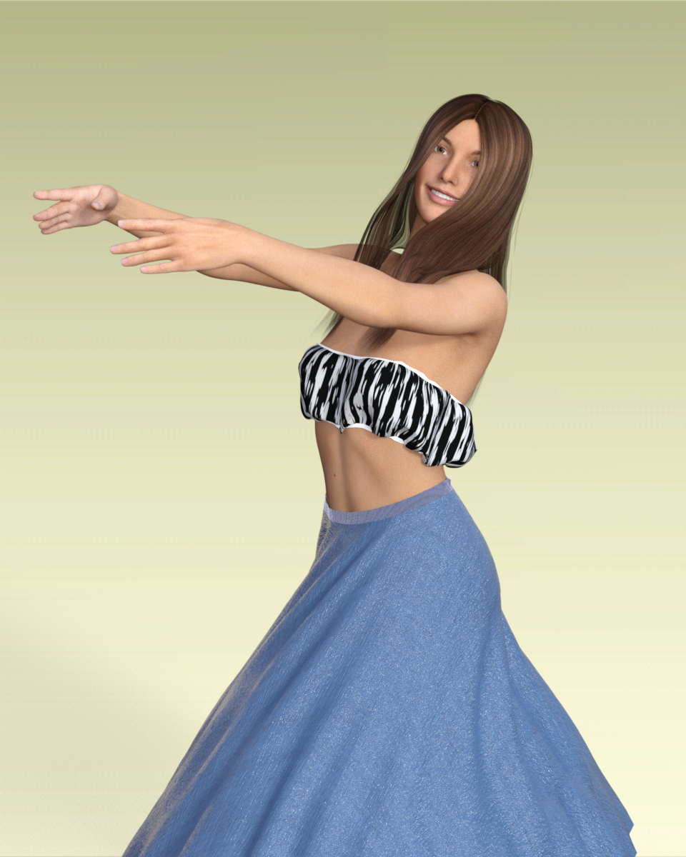 l. I added a series of dance moves so the figure rotated along the Y axis. I had to reduce the density of the skirt surface to 70 to keep it from riding up too high. The result is a nice swirl and uplifting of the skirt. Gravity and air resistance are at default, so the movement  of the skirt is all from rotation. This render is frame 10 in the middle of the animation. If you let the rotation stop and have any relaxation time, the dress will settle back into a typical drape.