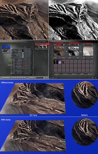 It’s not a serious app., but just one for playing around with, however, it can at times be useful when, say, you have a ‘flat (2D) picture and want to get more out of it three-dimensionally. Making a b/w of it, and then applying it as a combined bump, you can get some interesting results. There are probably other ways around this, however, it’s something I use now and then; giving my limited experience with Bryce. Note, ideally, bump maps work better as 16-bit, however, 8-bit (as here) can still be used. Also note, the below was applied to Bryce's 2D Face and Sphere, however, it can equally be done on a terrain, too.