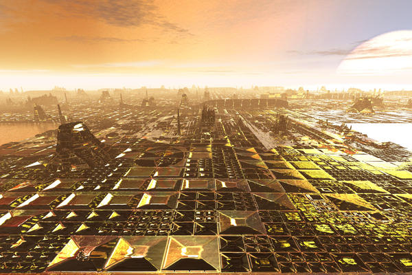 The terrain was made from a Bryce exported HDRI from the room I'm sitting in using Horo's little converter. The scene is lit by the very HDRI. Material is David's Solar Cell Waver, adjusted. 12 terrains total. The tower in the foreground left is the light from the bulb, the sun at right is the lamp with that bulb. I call it The Blast.