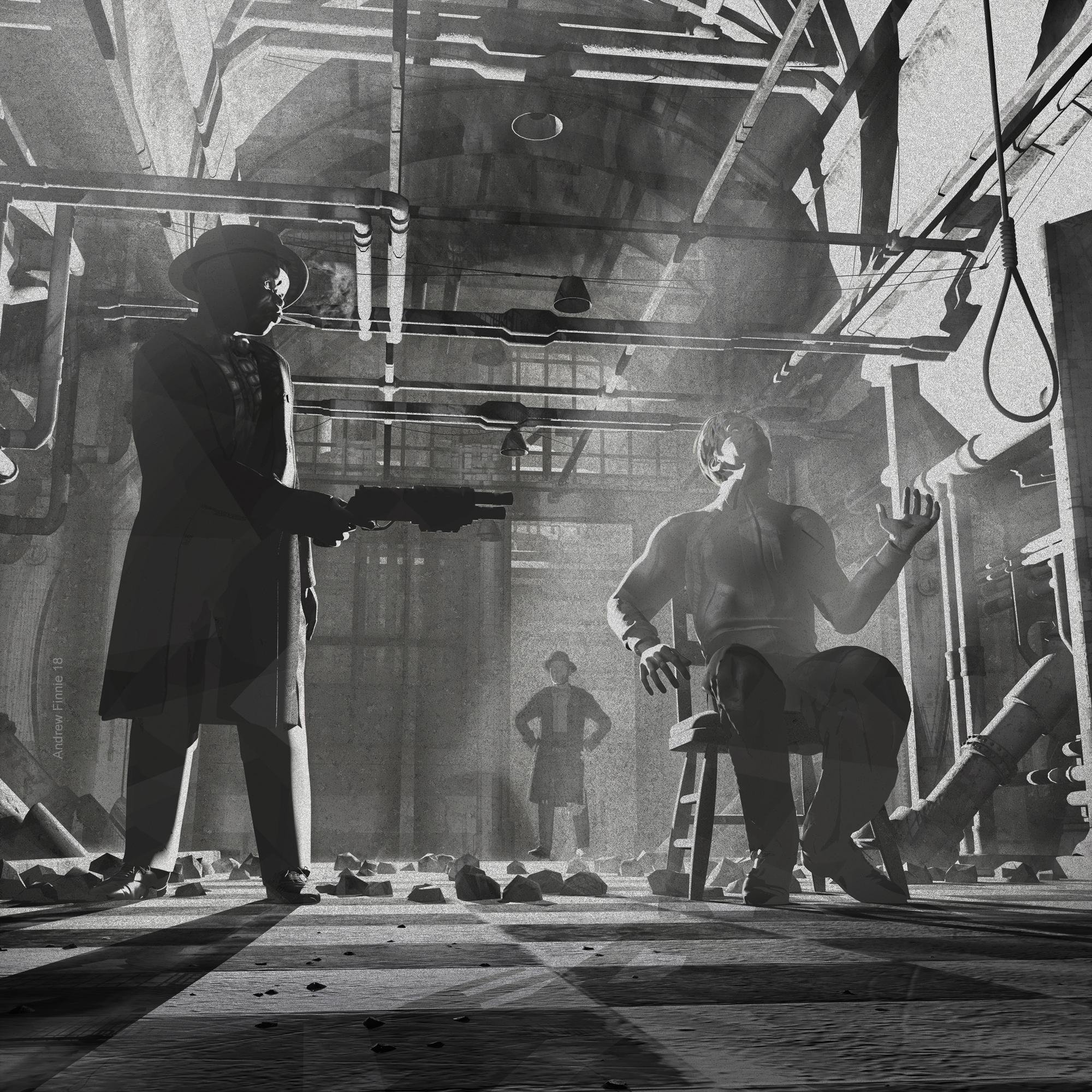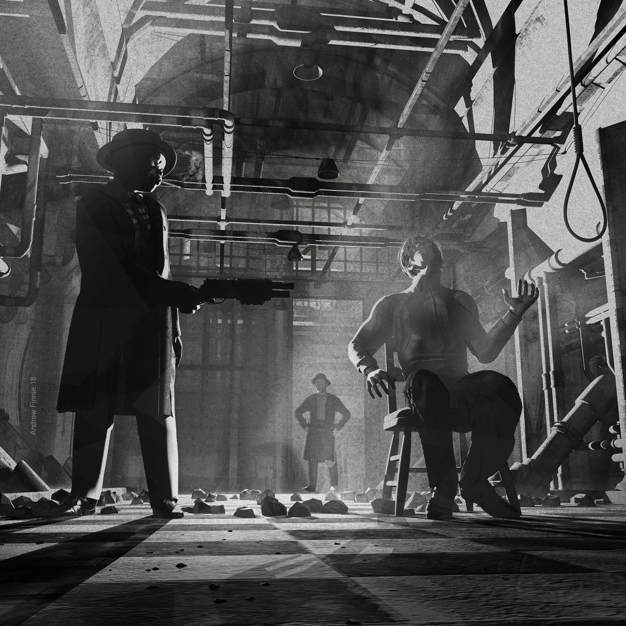 My favorite noir visuals do not just include shadows, those shadows dominate the screen and create stark contrast. There may be smoke or steam, but not enough to brighten the overall frame or eliminate sharp contrast. When my favorite noir scenes are showing, the movie theater is typically too dark to reach for the popcorn. The cinematographer and the director conspire to meld half of the subject into the shadows, because that is where my noir action belongs, in dark recesses. It is not uncommon for the shadows to be cast toward the audience, or more often from one side, even (or especially) if that means that detail on half the face/figure is lost. .That is why I expressed frustration in my update of bourbon drinking Fred when I added the crumpled photo on the table (and the associated light) because it also illuminated too much detail of other elements of the scene. Because I was doing it late in the game, I didn't have time to adjust the rest of the lighting. I thought Varsel had a good starting WIP along these lines. I was disappointed when I didn't see an entry.