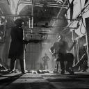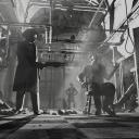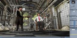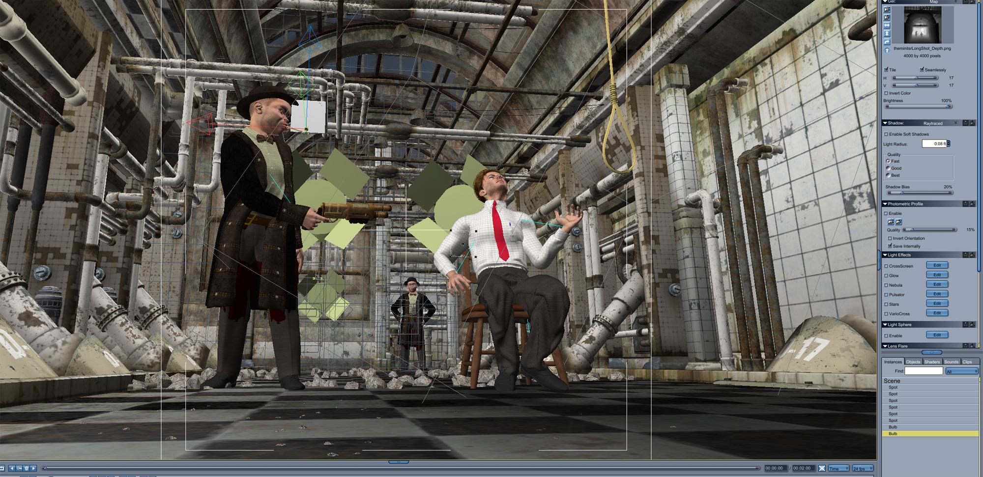Lots of lights, most of them are dedicated to lighting specific models. The pipe in the foreground has two. There is a main spot light above to light the figure models, a general bounce light, and specific lights to help each of the figure models. Two spots light the background elements with Angular falloff settings.