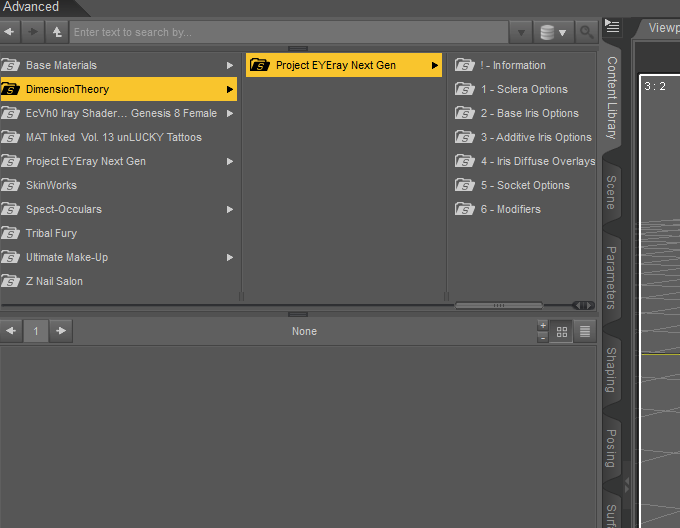 If you install with DIM, the path will be People>Genesis 8 Femal>Materials>DimensionTheory>Project EYEray Next Gen.