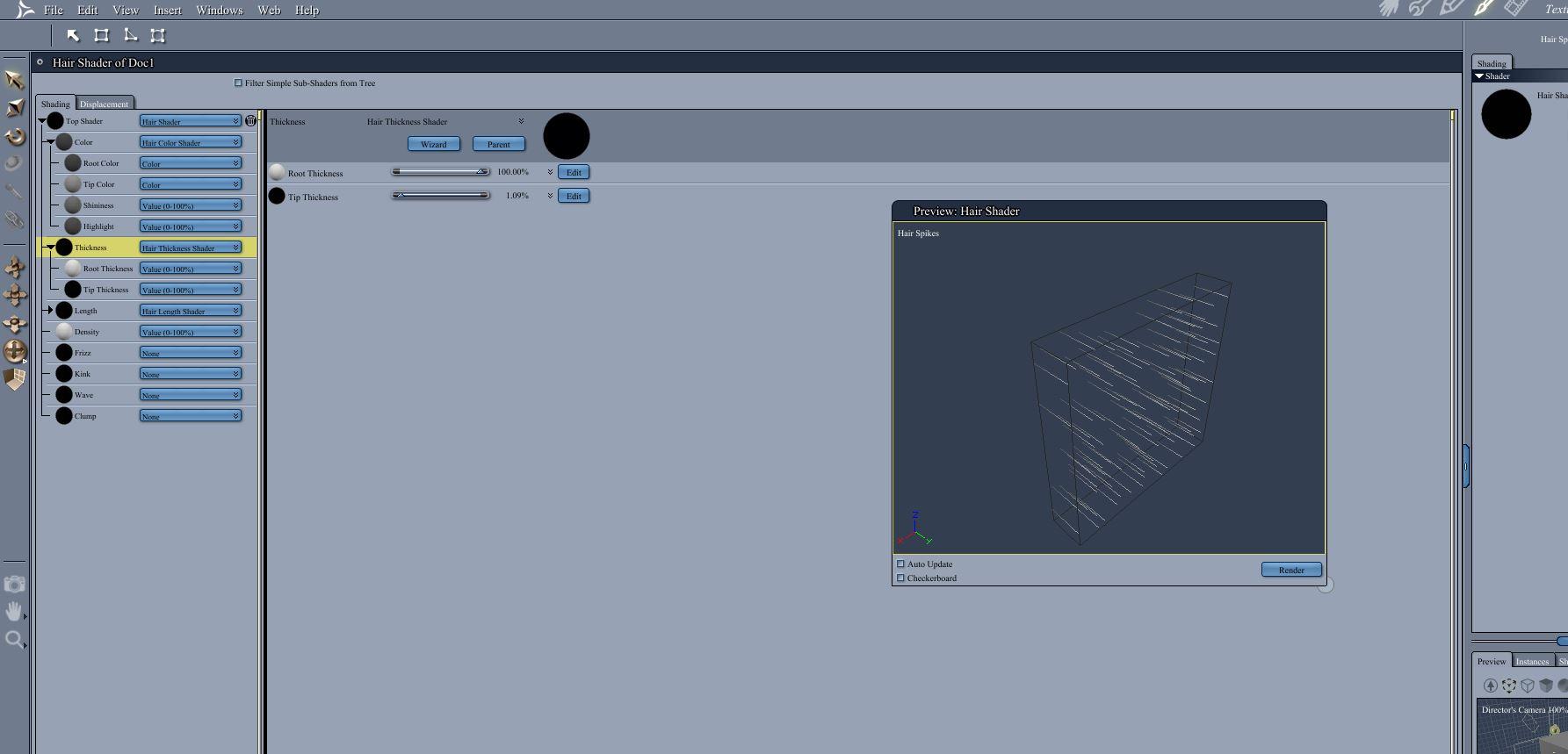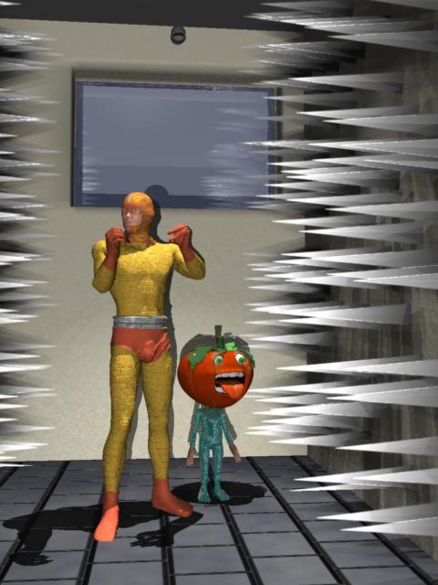 Meanwhile, back in some evil lair, Captain Sunburn and Tomato Boy (thanks, Stezza, for the suggestion) face the infamous spike wall trap.  The spikes are created with Carrara hair scaled up in the hair modeling room and then the hair shader allows control of the hair thickness at root and tip.  Root set to 100% and tip set close to 1%.  Still no votes on whether Captain Sunburn has a cape? I'm thinking that the evil foe will be in the window watching.  Any preferences on the evil foe?  I've also included a faucette above the window if some liquid is desired to fill the room to further endanger our hero. Maybe sunscreen oil?