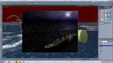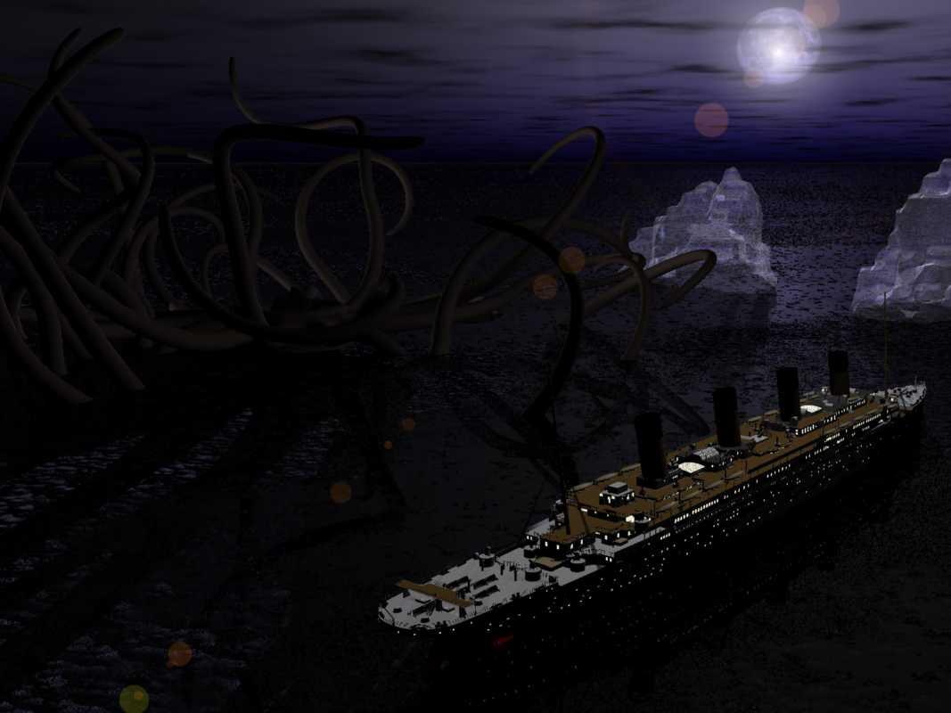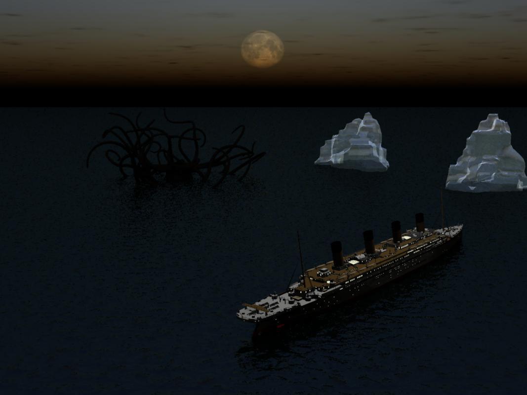 Looking good! Just a suggestion to make the kraken stand out a bit more. Add a light such as a shape light or a spot light and place it so it is next to the ship and aiming at the kraken. Set the light so that it only illuminates the kraken, and then adjust the color to match the light cast from the ship. Set a short range and a high falloff, and a lowish brightness. The light would illuminate the nearest tentacles and fade out quickly to keep the rest of the monster in shadows. I would also use soft shadows with the light to suggest a more diffuse light such as the light cast from the myriad ship lights. Again, this is only a suggestion. It is a great and imaginative scene!