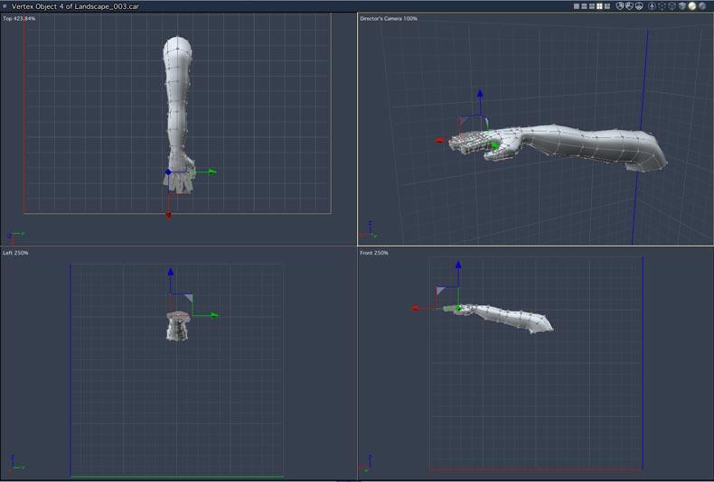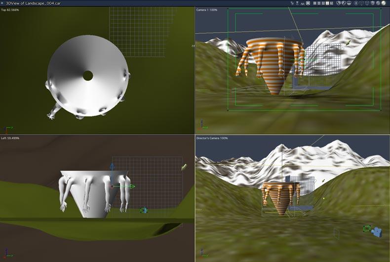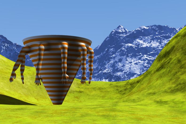 The back mountains are made from a Terrain object, - just dialed in some mountains. The foreground was made using a custom height map made in an external app. The tornado thing is an entity from my paintings. It will have a central eye and be hurling a volley of flying forks at two hapless people fleeing for their lives. Plan on using some hair for close up grass and have an idea for an experiment using metaballs. Modeled the arm and the 'tornado' today. I also did a test render with post work, mainly the back mountains.