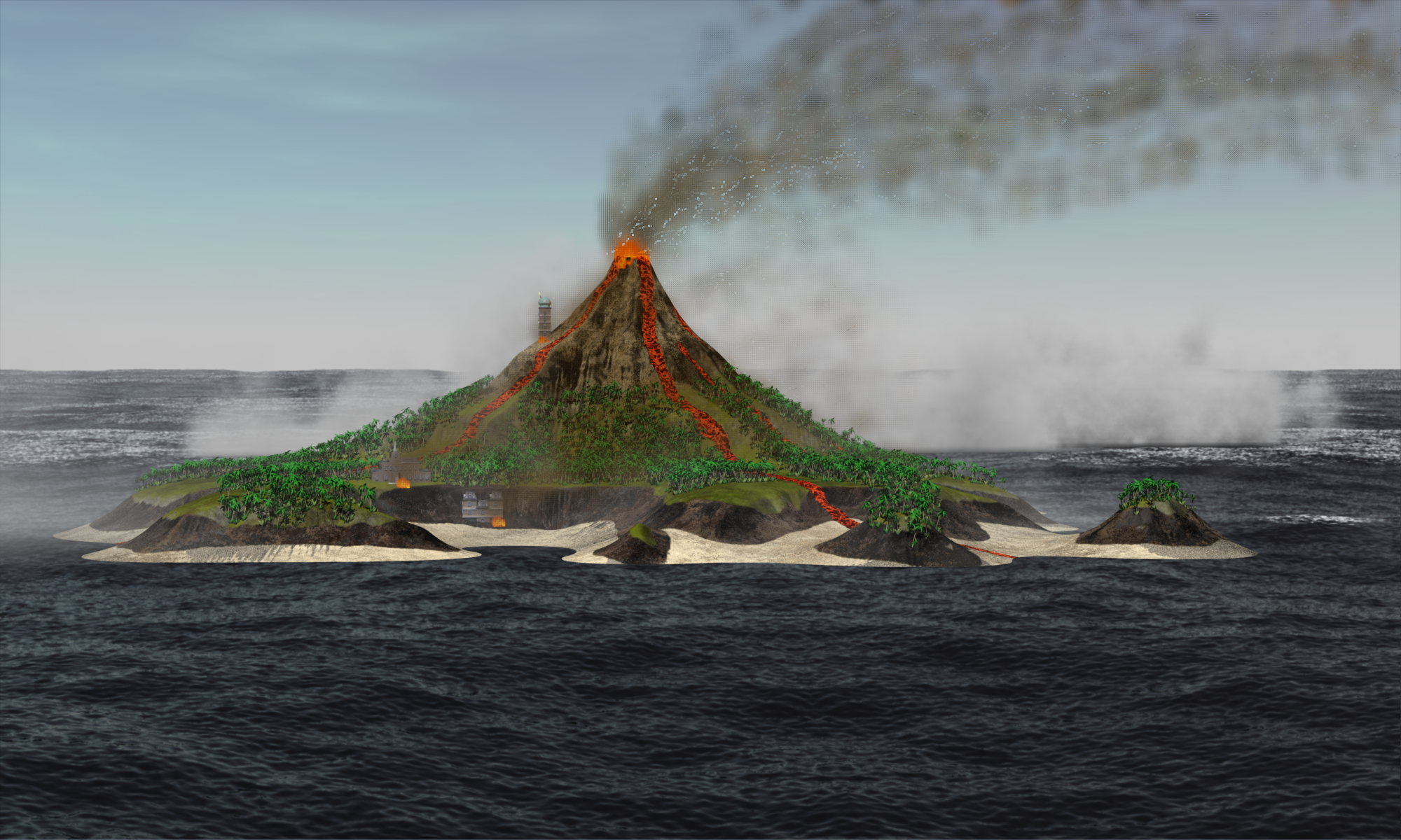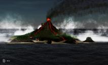 Thanks, EP. Great advice. The sea/sky are a separate render from the island. I reduced the sea terrain size in the replicator, reduced height, and added more noise. Hopefully, that helped with the scale of the island. I also increased the atmospheric haze scale and density, and added more red, but didn't get the desired effect when slotted as the background with the island. Therefore, I also added some volumetric clouds behind the isand, which could also be steam from lava in the back of the island hitting the ocean. Not sure about depth.