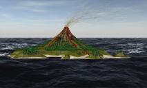 since I'm not going to have an ancient near Eastern god bite the gentials off another god and spit out 3 new gods, I decided to use my terrain stream technique to create lava flows. Here is a supervillain's volcanic island. I made some hair and brushed it out of the volcano cone like smoke. I applied a kink shader to the hair, converted it to vertex object with Philemo's plugin, ad then applied a blur in the effects tab to make the hair look like smoke. The low res palm trees that I modeled are replicated on the island.