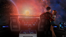 I rendered three passes of the scene because I was not getting the effects I wanted through the windshield with the aura and lens flares. I rendered a scene with alpha for the flare, the interior with alpha and relfections on the windshield, and then the base layer with the planet, sun and nebula with no alpha. I kept the lighting the same for each render except for the interior lights of the ship in the lens flare and base layer renders. I adjusted the intensity of lens flare down, by reducing the opacity of that layer.