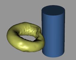 i. Run the simulation. You will see the torus partially collapse when struck by the cylinder. Momentum is transferred to the torus, the torus’s surface will rebound, and it will fly away.