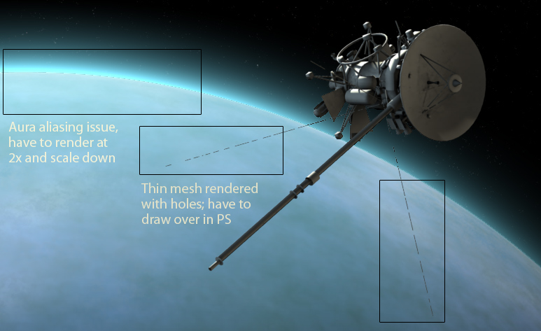 I'm having these issues with rendering: Thin objects are rendered with holes, and there is quite a bit of aliasing when I use the Aura effect. Here is my image: Render problems