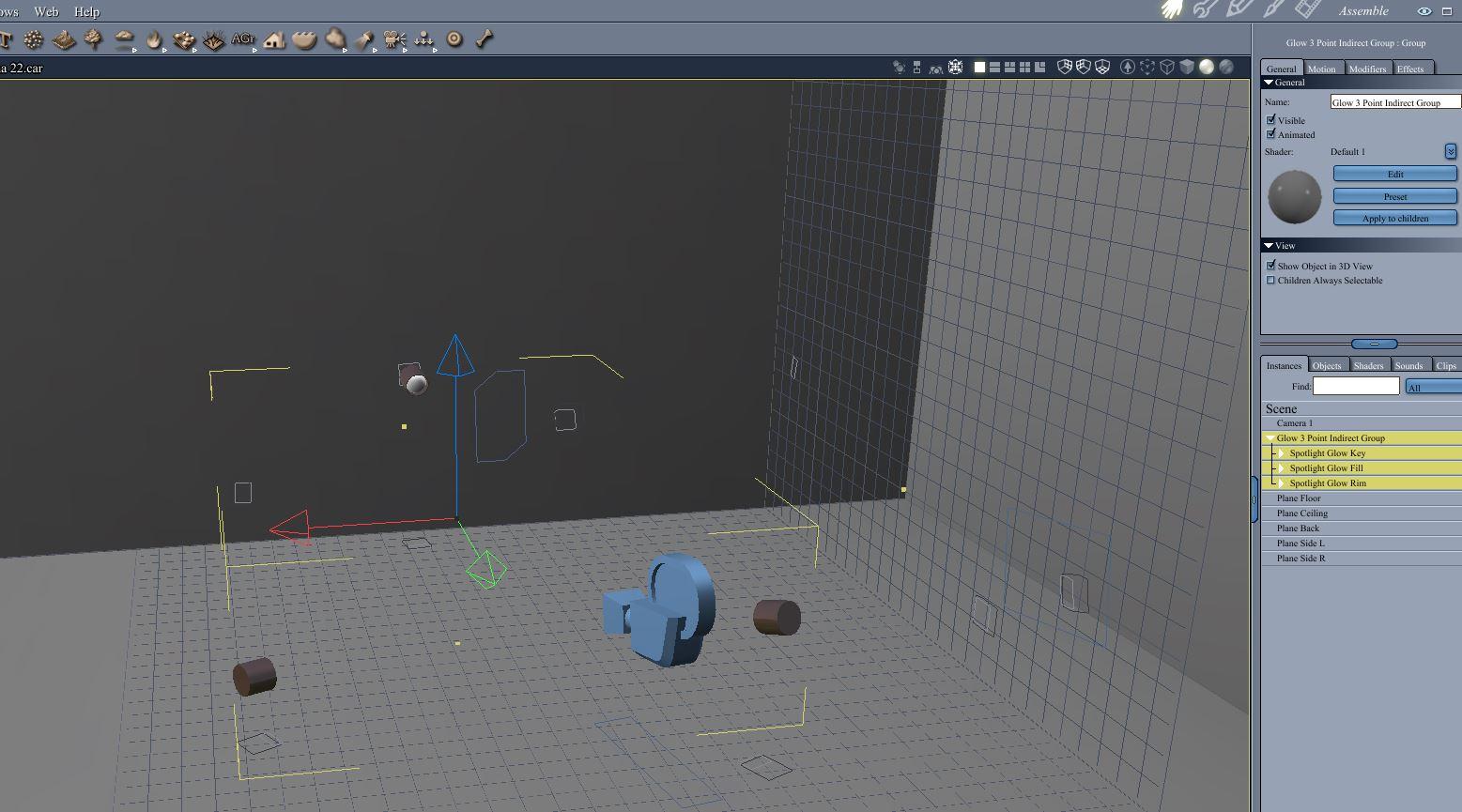 Had a conversation that got me interested in attempting more realism than I normally do. I've watched PhilW's tutorial and I've followed some of the forum discussions, but hadn't paid as close attention as I probably should. I highly recommend Phil's realism tutorial. I don't have any of the HDRIs that can be shared, so I made a simple 3 point lighting rig of glowing sphere spotlights. The bulbs are cutouts of vertex spheres, and they are contained in a cylinder, sort of like a regular spotlight. The shaders for the bulbs have glows with values over 7,000 depending on key, fill, or rim. Similarly, the glow channel of the bulbs are multiplied by different colors for warmth or coolness. I have indirect light enabled. I have gamma set to 2.2. I have placed the rig inside a simple box made up of planes with the default shader.