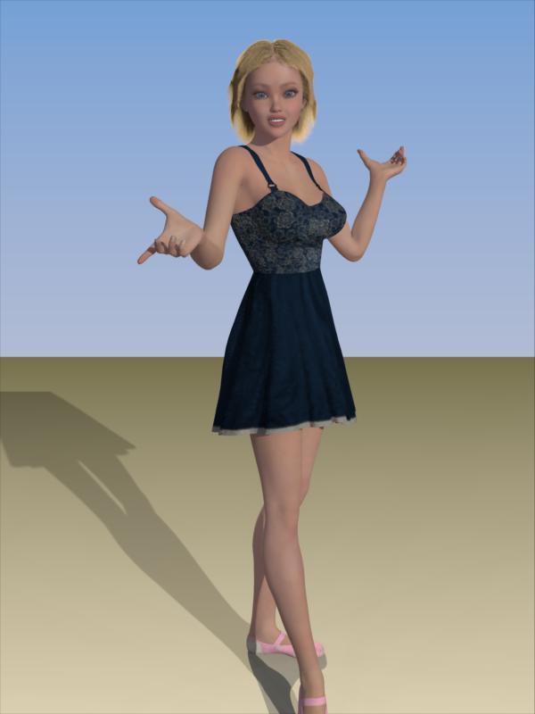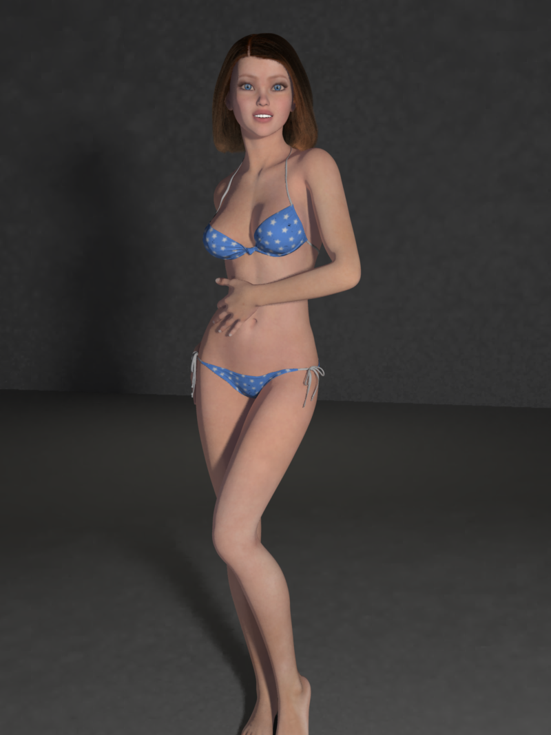 Test #1 - simple figure made up of items acquired fom the Daz store. This is the G2F Ysabeau character (slight other dials spins) wearing Hongyu's bikini 2 with '5 Times a Lady' long hair. The settings for the skin shaders are similar to settings for any of Ringo's skin shader products. Pose and expressions bought from Daz store.