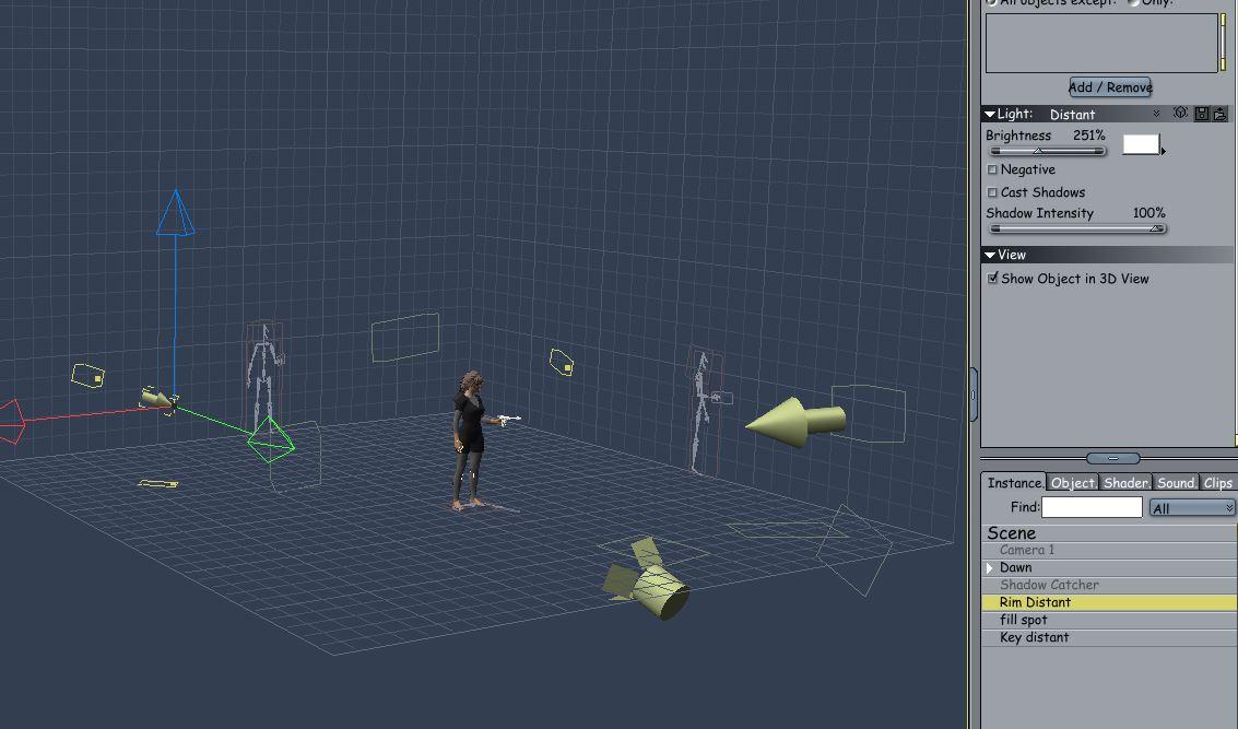 This is not set up to be the entire illumination - just the character's solo illumination. This way I can light my scenes and save them independant of the characters. The scene lighting with then catch the character and create the shadows from the character onto the scene, etc., and scene shadows will always be hindered on the character via this rig.