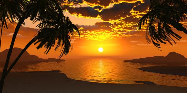 The without text took well over a day and a half to render (including AA pass). My guess is the palm trees I used had a lot of transparencies in them and that slowed the render. I also noticed that some of the palm fronds did not render properly so I re-rendered just one tree (the one on the left) with a neutral grey background and it still had the issues with the fronds. So in the one with the text I deleted the trees and rendered the scene. Then I used the Tree Lab to create a Palm tree and rendered that against a grey background and saved the image. I went into my graphics program (GIMP) and changed the grey background to transparent. Finally I layered that on top of the rendered sunset background and added my humorous (to me at least) text.