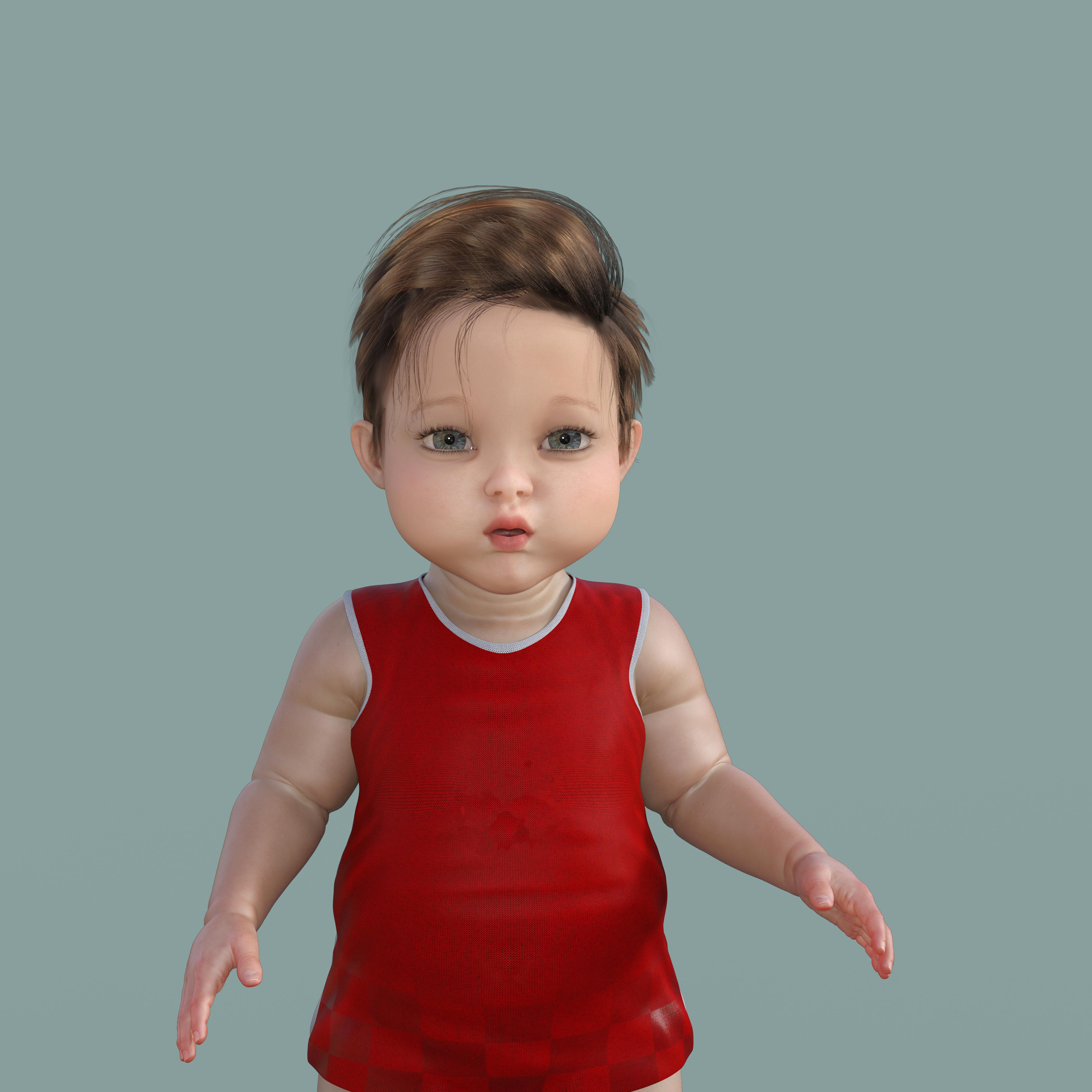The head well those are plump cheeks and double chin to be sure but it looks like that fat just might as well be actual cheek bone and lower jaw bone and not fat deposits, at least in the renders I saw. The head looks to small in proportion the the body for a new born but for a todler it is OK. However for a todler the eyes are too sleepy. Their eyes look huge at that age. The eyes are sleepy like in a new born. Also even at todler age cheeks & a double chine that plump should look more like fat deposits and not like possible bone geometry.
