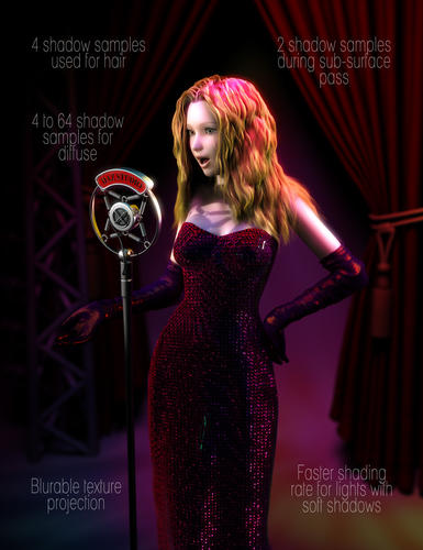 The Advanced Spotlight has all the same flagging options and the hitmodes as the Advanced Ambient but also uses a faster raytraced shadowing function than the current DS default lights. The light also supports 4 falloff modes, light gels and also works as a point light.