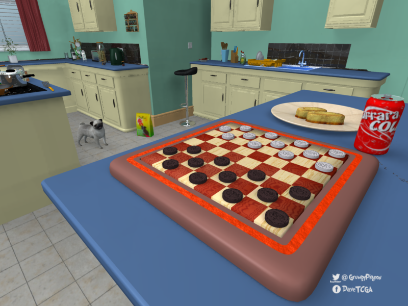 a wacky draughts board with pieces and a morphing domino with box. and the Bump map to apply to the draught face.