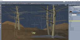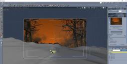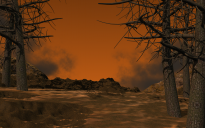 Pondering an unstructured entry and was thinking of a basic scifi post catastrophe image.  How is this for irony, probably a very structured composition like a Frazetta or Hoffman sci-fi triangle for my unstructured image.  I put together a some quick elements.  To make the backdrop, I used a black/orange color gradient in the background, a relatively detailed foreground terrain, two less detailed distant terrains, some distant dark clouds, and a few twisted trees (use curve settings in branch edior) without leaves.  I rendered out the terrains/trees image.  I saved the terrain and lighting elements.  I started a new scene, reloaded the lights and foreground terrain, and inserted the first render as the background.  I reduced the resolution of the terrain, which is set as a shadow catcher.