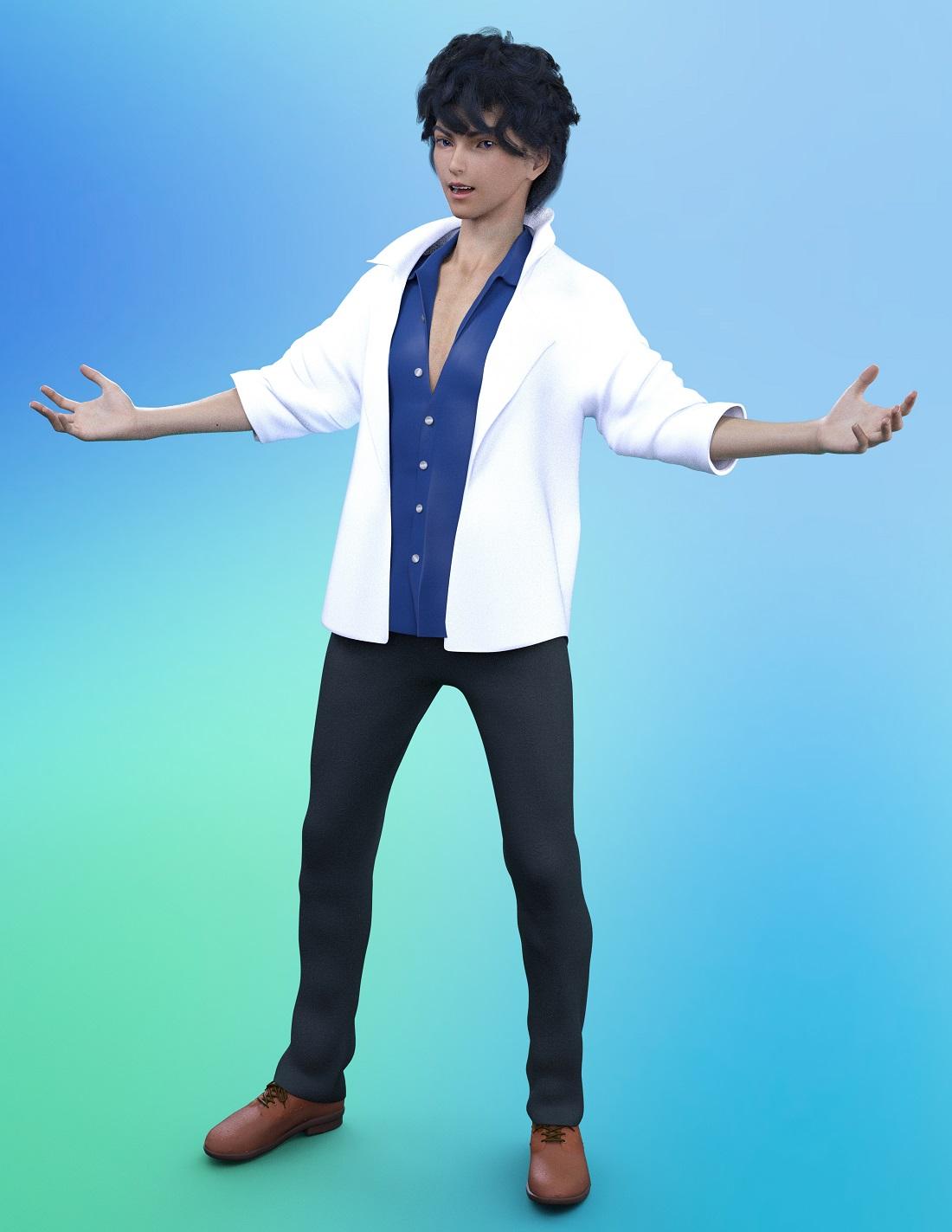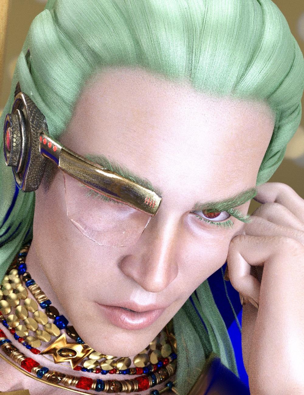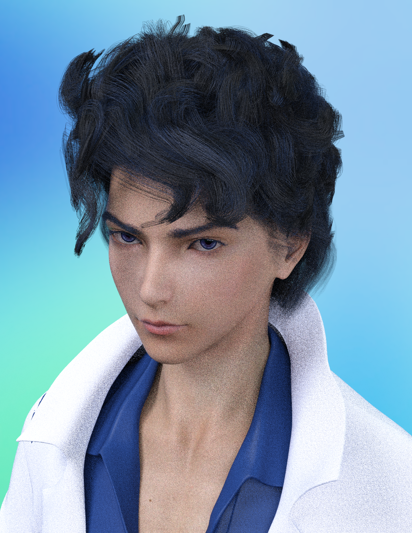 This second render is one I've been working for a while too. Finally, I found a nice skin for this character because he's meant to be very fair. (The skin is from ChangelingChick's Foster for G8M.) I regret not picking up Foster sooner. He has a lot of option including nail morphs which many of the other G8Ms I've picked up lack. His shape is nice too, but this was another character whose dial-spun result I'm pleased with, so no Foster shape. Not clear on this render either, but Foster has a beauty mark on his left eye. This character wasn't meant to have that but at the same time, it fits him.