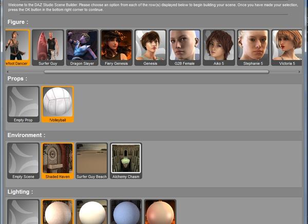 Welcome to the DAZ Studio Scene Builder. Please choose an option from each of the row(s) displayed below to begin building your scene. Once you have made your selection, press the OK button in the bottom right corner to continue.
