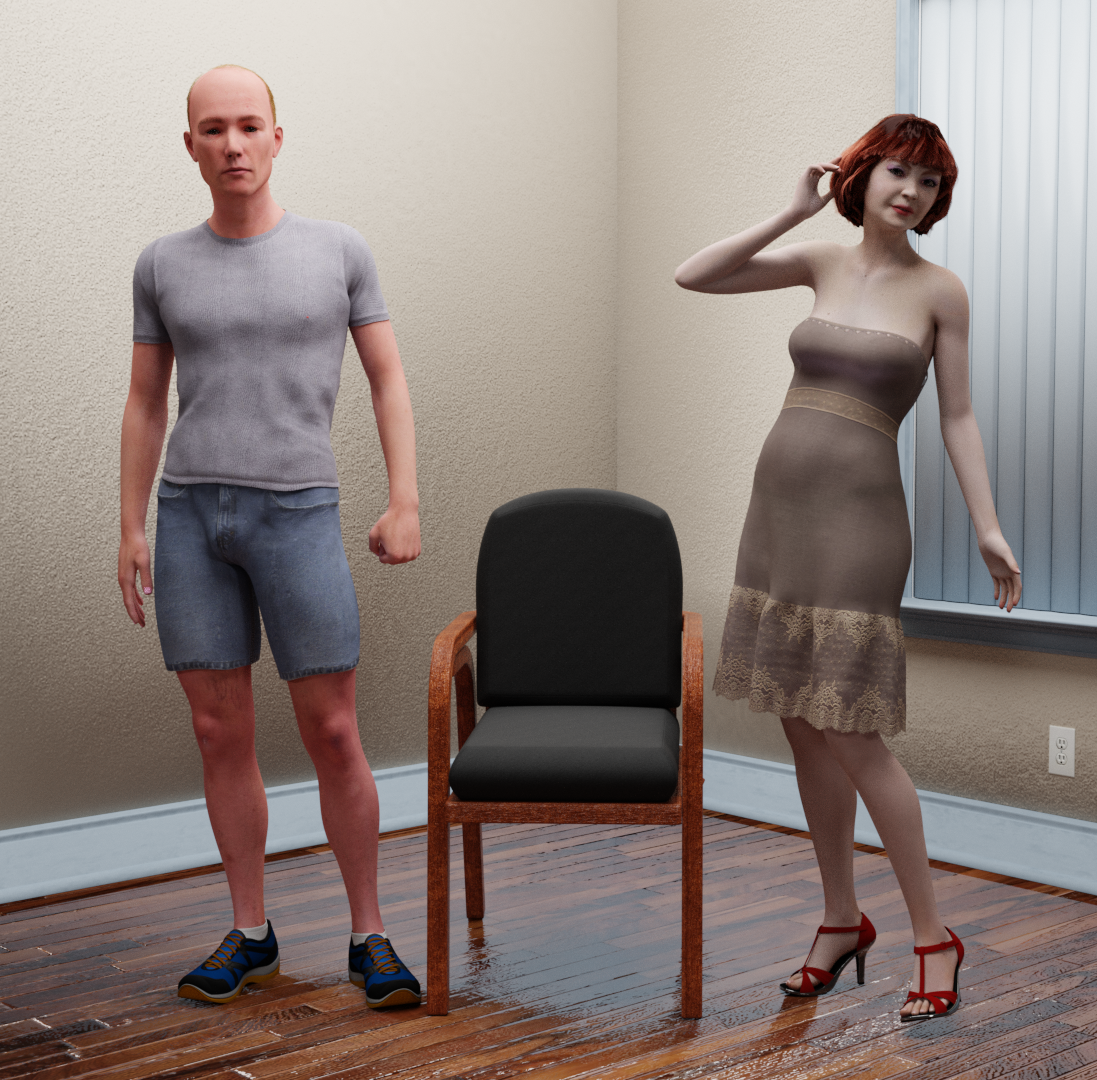 The male is a G3 character called Dale. He comes with IRay materials so no need to convert - I only use IRay materials. I have checked that I didn't use 3Delight by mistake (I didn't). Getting late here now so I'll try a standard G8 or G3 tomorrow.