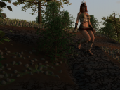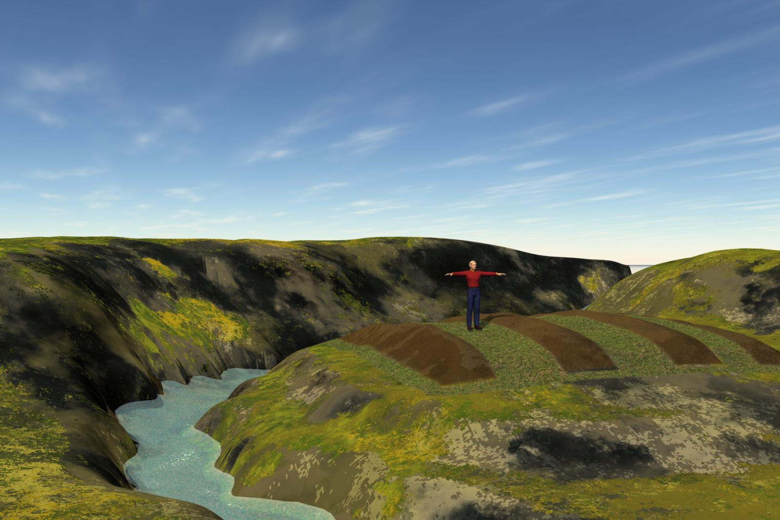 This is just a WIP.  My heightmaps are too steep and th shaders suck.  However, I ike the concept of the garden being carved out of the larger terrain next to a stream. Hopefully, this crappy WIP is still good enogh to see the ochard to the right of the stream, with separate shaders for the aisles and the mounds.