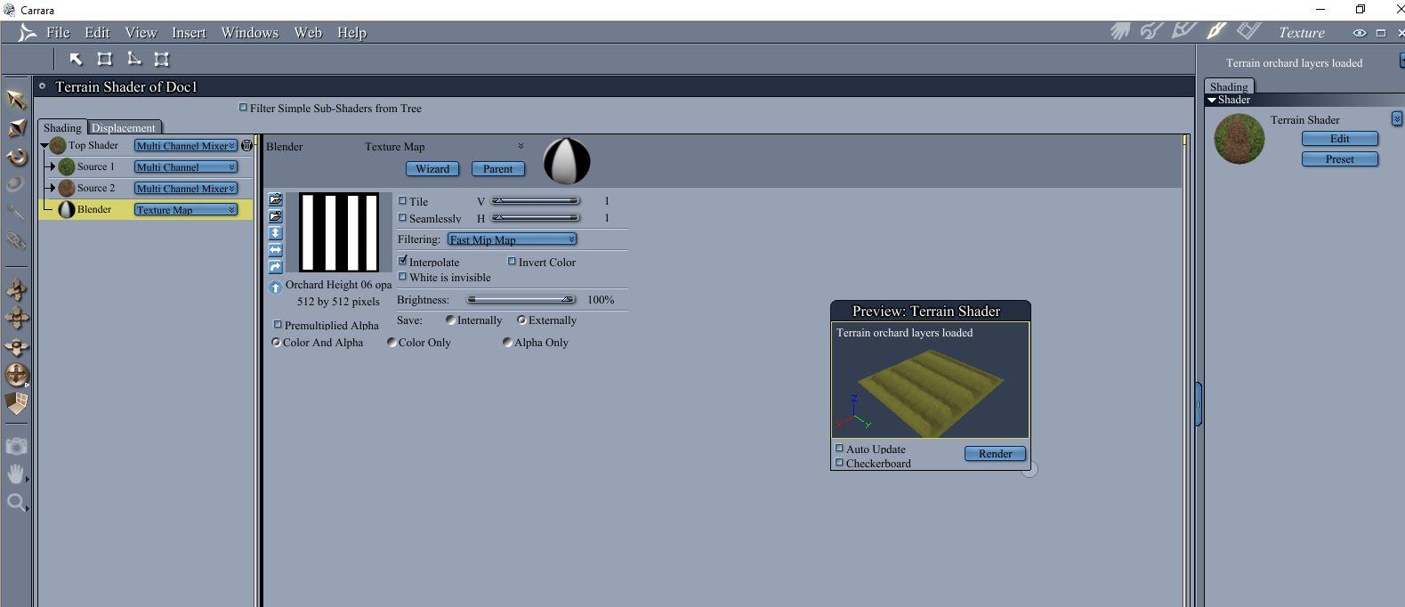 Terrain shader - I change the default shader to a multi channel mixer if I have just two regions.  Use a layers list for more complicated terrains.  For this, I used a simple grass texture for the bas shader and mixed some brown with a mesa shader for the mounds.  I used the saved opacity mask in the blender channel of the multichannel mixer.