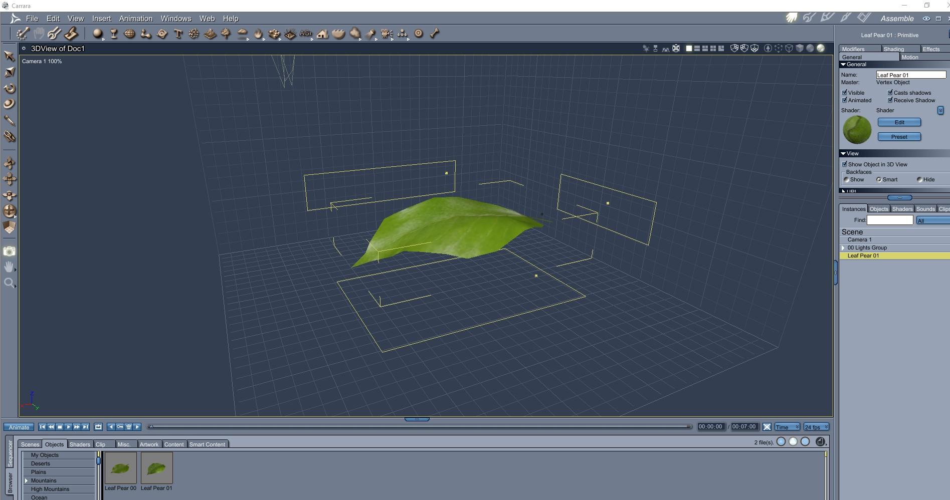 13)  Return to assemble room.  Your model should now be shaped like a leaf, and have a leaf texture applied.  If necessary, rotate the leaf so that the bottom (stem) is at the right edge and the tip is on the left (X axis), instead of up and down.