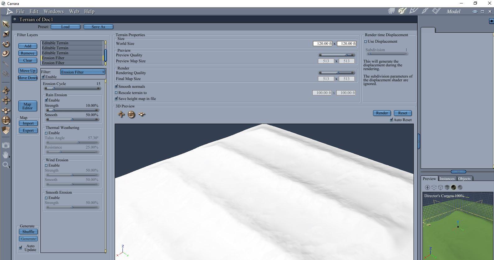 I remove the default terrain generator, and load the maps at very low elevation.  I load the gradient first to make sure the rain erosion filter flows off.  Just set elevation to 2 or 3 feet.  I then load the terrain heightmaps that I created starting with the most blurred and proceeding to the least blurred.  I decrease elevation of each that I load.  I then apply my first erosion filter, rain.  After it calculates and looks awful, I reduce the strength very much.  But to my eye it now looks too smooith.  To rouh the terain up a little, I then apply a second erosion filter, this time wind.  Again, I reduce the strength substantially.  The result is a slightly uneven terrain with a few rows of raised mounds.