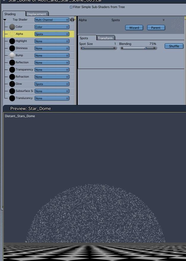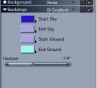 The backdrop sky image was made using a combination of a Bi Gradient and a large half dome covering the scene with a shader using Natural Functions > Spots. I also added an Aura to the dome object. The reason I had to make an image and drop it in the backdrop using the 'Map' option is I have two star domes - the distant stars and the yellow stars. Both have Aura invoked, and when rendered together produced some strange stippling artifacts. Neither was casting or receiving shadows, so I just rendered the Bi Gradient and Distant Star Dome together and that solved the issue. smiley