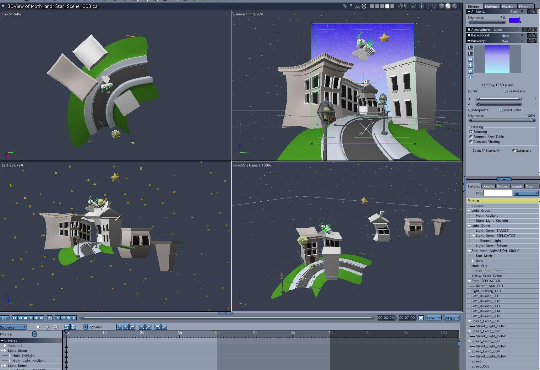 Each street lamp has a Bulb Light, but with very limited range - mainly wanted to experiment with the Light Sphere option. Screen grab of model has 2 glass panes hidden (in the Vertex Modeler go to View > Hide Selection) so you can see a modeled light bulb inside.