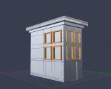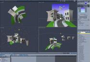 The buildings are really simple models started from a cube in the Vertex Modeler. I just cut in or extruded the necessary details. I then applied various Modifiers to each building in the Assembly room. The building on the right has a Taper Modifier, the first on the left has Warp, next Wave (on the Z axis), next Wave (X axis), next Bulge and last, Taper again.