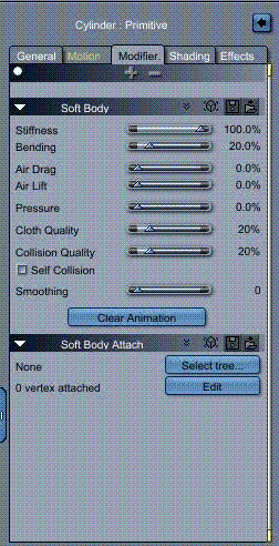 4 Now add a soft body attach modifier. Use the button to select one of the cones. Use the other button to bring up a brush which you can re-size. Paint a few vertices at the mesh corner below the cone you selected earlier. If you paint too many you can subtract a few (look at the buttons at the top left of the scene window)