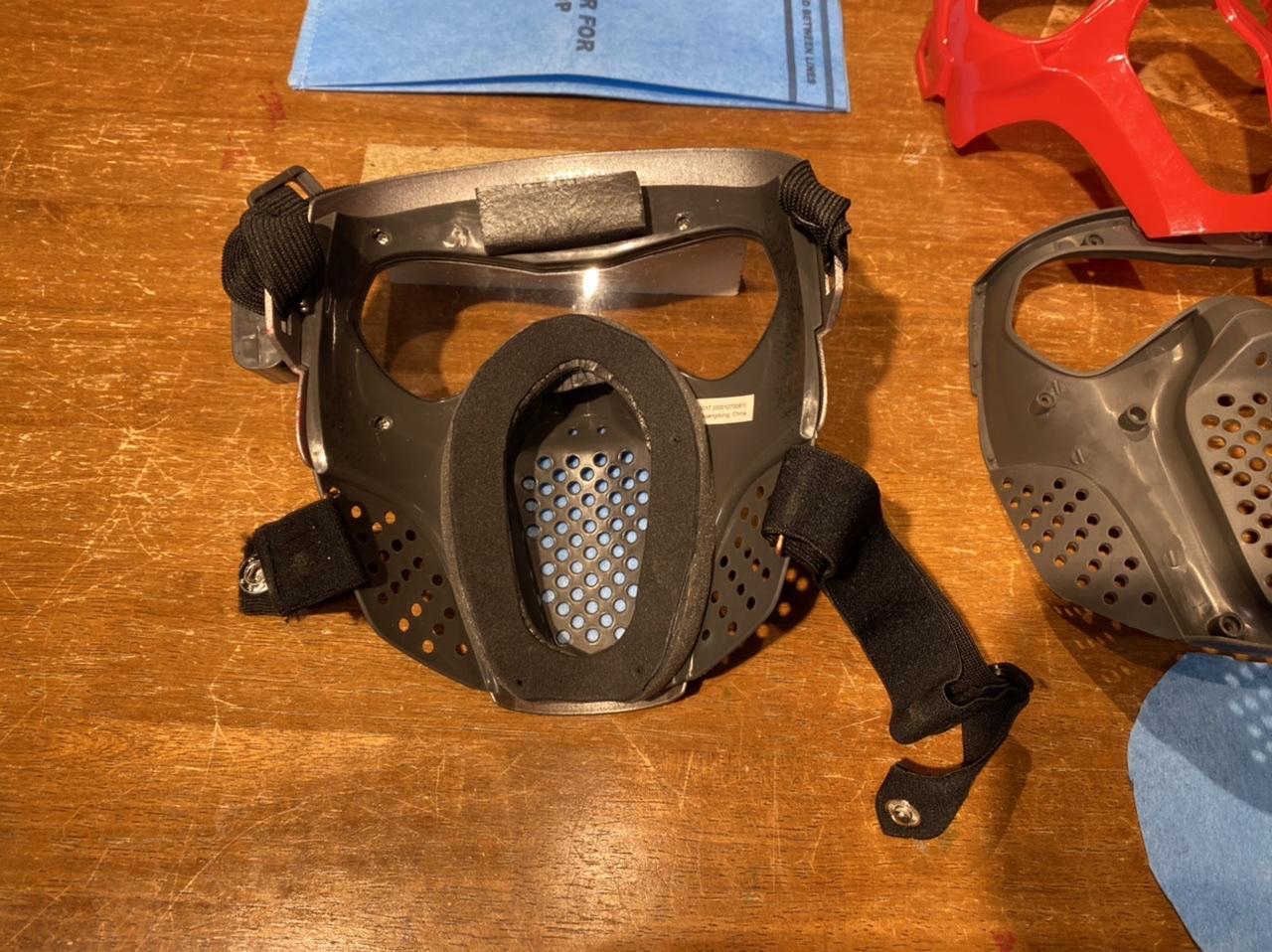 The mask has been modified with a gasket inside to seal off the nose/mouth area... the gasket was made from thin craft EVA foam and self-adhesive insulating weatherstripping foam... I used 3/4" thick weatherstripping, but I think 1" to 1 1/4" would work better for most people. I also added a lower neck strap for better fit...