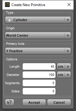 4. I will use a primitive cone as a proxy shape for this tree. In Daz Studio go to the Create menu and select New Primitive... When the dialog opens select Cone in the first drop down box and set the rest of the values as shown below. Click Accept. The cone will appear in the scene. Verify that it is about the size of the tree.