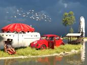 I like it. Looks a little like the Outer Banks in N.C. or something ;) I duplicated the terrain, enlarged it and pushed it way into the background to break up the horizon.