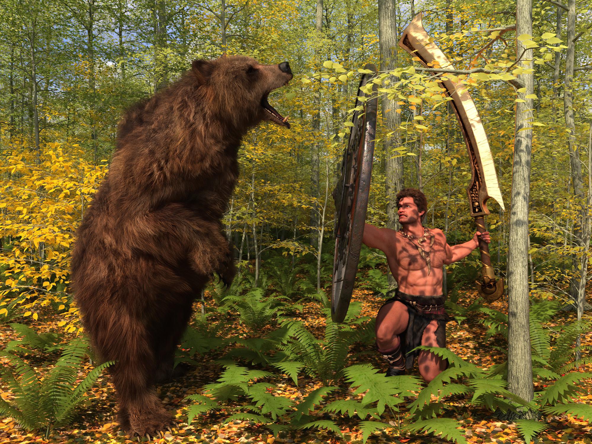 What he needs is Archmage Serena, head posterior kicker with the sisterhood of the Future Mages. She kills huge evil monsters for a living. Dealing with a mere giant bear would be no problem at all.
