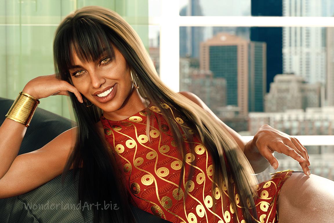 Here I tried mixing her with a Mousso character. I really like her skin! The dress is the Papyrus top without sleeves with the Egyptian shaders because there were no textures/materials included as mentioned above. I didn’t think I’d have much use for the outfit but it’s cool it can turn into a cute little dress. I can use the bell bottoms separately for 70’s renders lol. This is Neve hair, I didn’t even try the deforce hair because apparently it has to be fixed because there’s a problem rendering it even on 2080 tis!