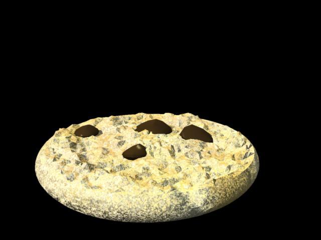 Here is a simple cookie, started with an oval, tried to get a crumb top using a displacement. Procedural shaders.